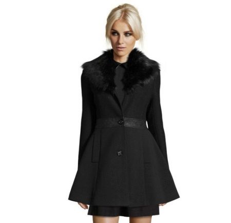 A fitted black coat with a flared skirt. Bright dresses with a flared skirt will also look great with such a style. It is important to monitor the length of the dress, it should not peek out from under the coat. You can try look with skinny jeans. The main thing, when choosing such a style, do not wear shapeless or voluminous clothing, save it for other coat models.