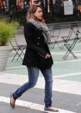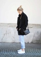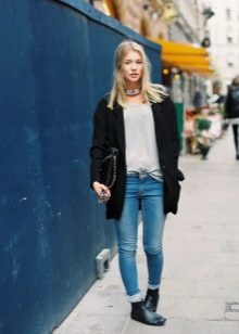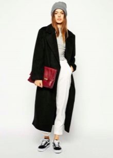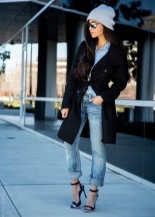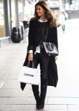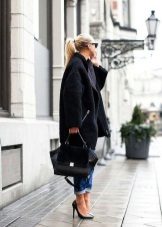 - A classic combination of black and white, a coat with cropped jeans. The top should be quite pale, and you can add colors with a bright bag.