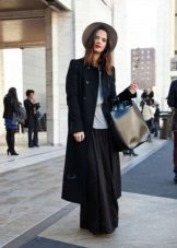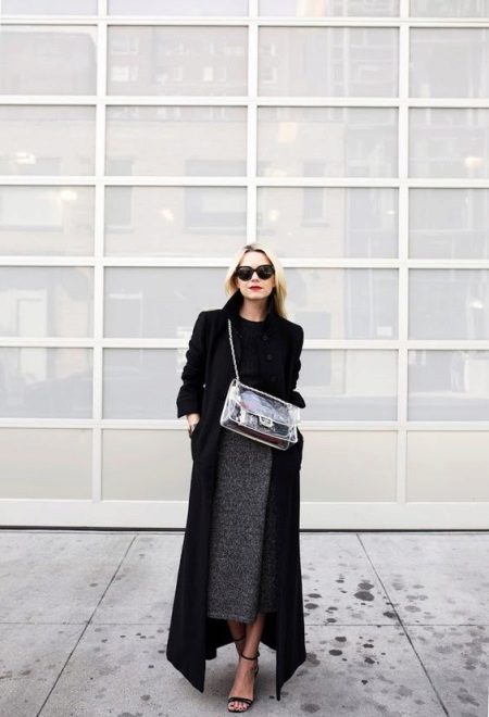 - A maxi coat with a long skirt is the standard of femininity and elegance. To top it off, shoes or heeled sandals and an original cross-body bag.