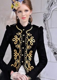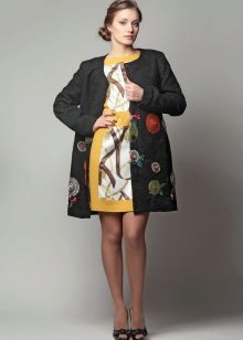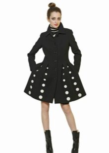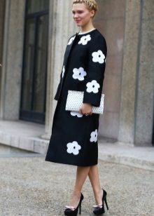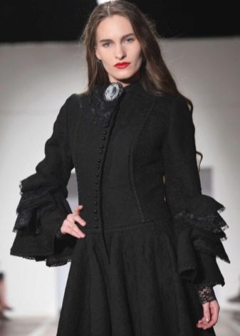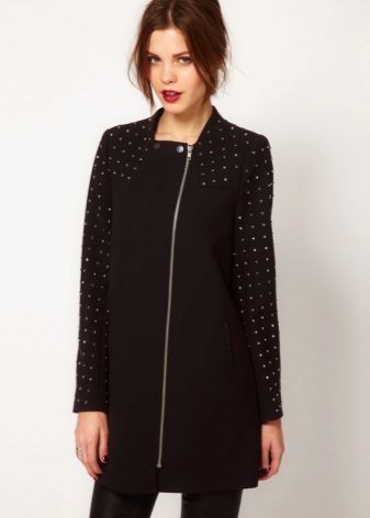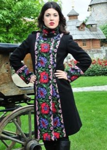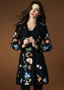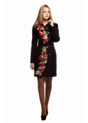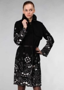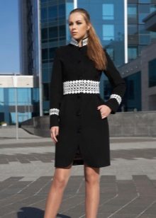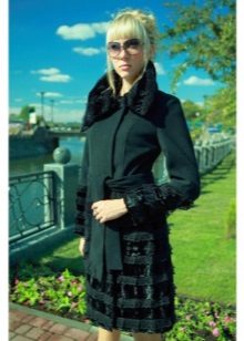 A black coat is a fairly classic, strict version of outerwear, but there are many products with a bright and attractive decor. Ornaments can be stones, beads, buttons, large rhinestones sewn to individual details (lapels, cuffs, pockets). Embroidery and application allows you to lay out an interesting pattern or pattern. Lace inserts and embroidered details are used.