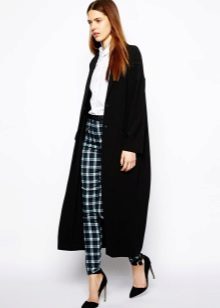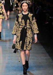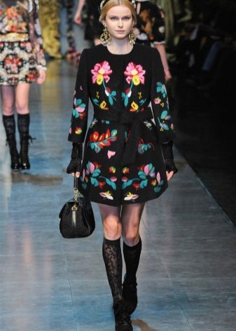 This year, animalistic and floral ornaments that are laid out with applications or embroidered on fabric are in fashion. The most striking and rich in color ethnic motifs in the drawings. On black they look especially saturated. It is possible on a coat and print, most often it is a cell of different sizes, styles and colors. As for the decor, everything - lace, buttons, stripes, waistband - can be deliberately executed in light or colorful colors, creating a contrast with the dark base.