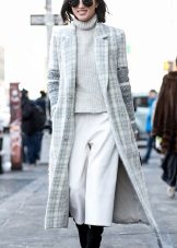 An image created from a combination of a light pink skirt just below the knee, black socks and light sneakers with a thick sole looks quite elegant, but very unusual. The highlight of the image is that both the top of the cappuccino shade and the long gray coat are made of the same woolen fabric and differ only in color. Complementing the look with a white bag, as well as rolling up your sleeves, you can give along a slightly sloppy, daring look.