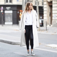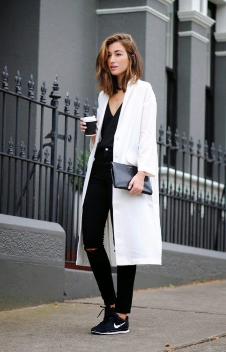 An image with light elements of a sports style also looks quite impressive, and playing in contrasts makes the outfit a winner. Black jeans with torn knees, a black cashmere pullover and a white elongated trench coat are a great option for a weekend get-up. And small details such as black and white sneakers and a black rectangular medium-sized clutch will be a great addition.