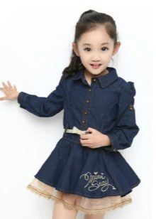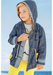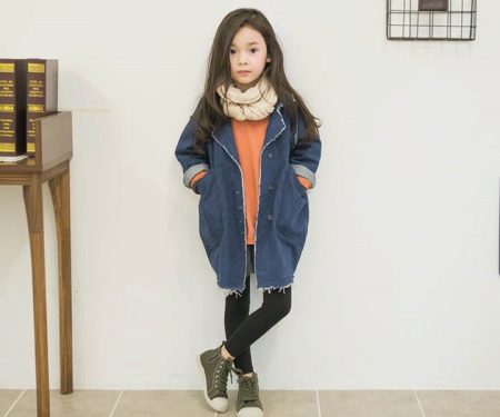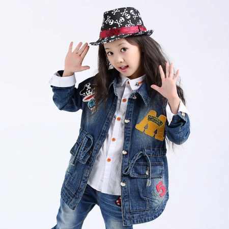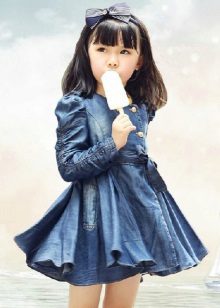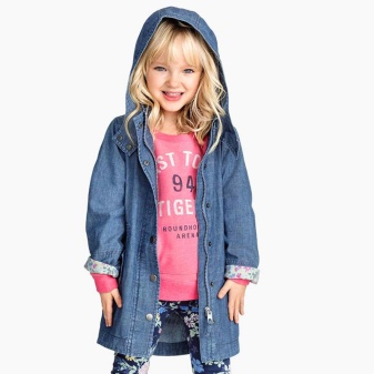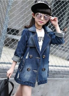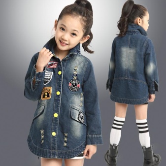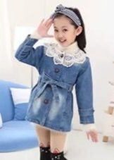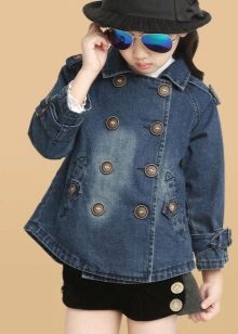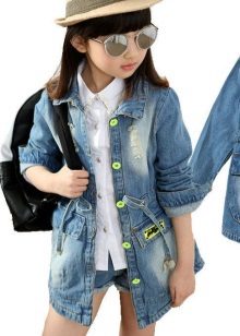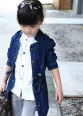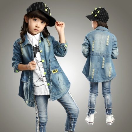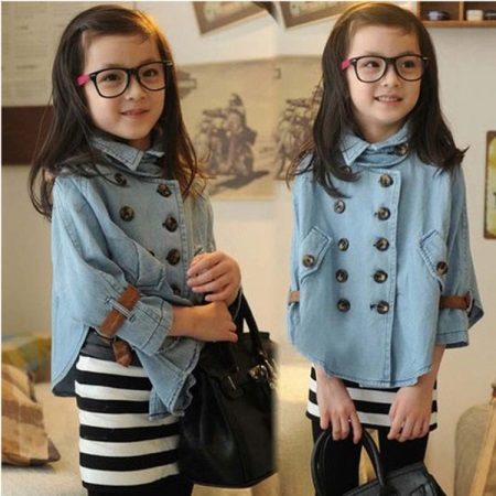 Denim is pretty easy to combine with the rest. Therefore, it is very difficult to imagine the hangers and shelves of the cabinet without the usual jeans trousers, skirts and jackets, especially for children. A coat looks very cute on girls, so it will take its rightful place in the wardrobe of a young person.