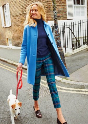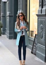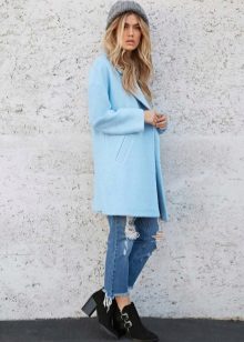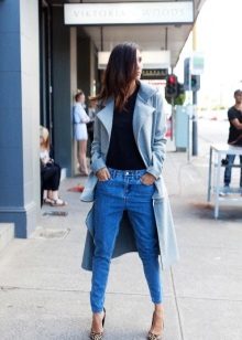 The most common tandem is a blue coat with black jeans. The style of jeans can be different, even the length does not matter. Cropped jeans in an ensemble with a blue coat look spectacular.
