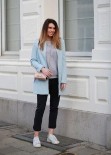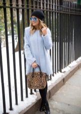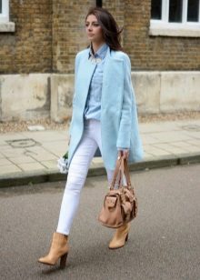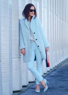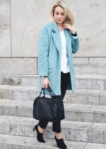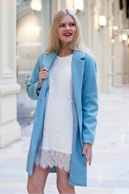 The coat in a pale blue color blends nicely with black clothing. Cropped jeans, a turtleneck and flat shoes in black are a good choice to complete an everyday look. The perfect complement will be a capacious handbag in the tone of shoes. In such an ensemble, the coat will become a bright accent, will refresh the image and give it elegance.