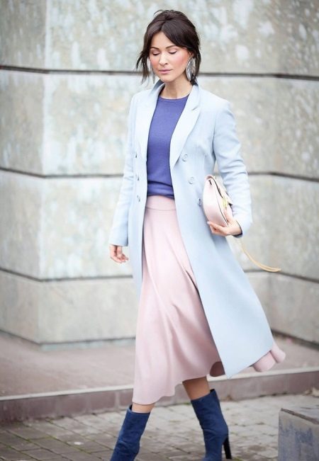 A delicate pink skirt below the knee length, a blue loose top and suede ankle boots to match the top looks business-like and sophisticated. A blue coat knee-length gives the image of charm and originality.
