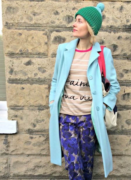 A blue coat can be worn with clothes in beige, yellow and even red. Looks impressive red or orange.