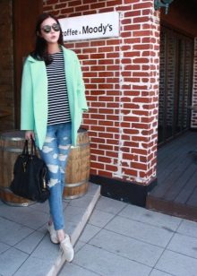 The coat can be worn with trousers, pipes, with a skirt or dress with a straight cut or slightly flared down. Jeans will do too. As accessories for the coat, the same wardrobe elements are used as in the case with conventional styles. It can be a hat, hat, stole.