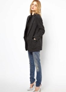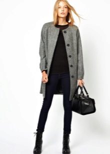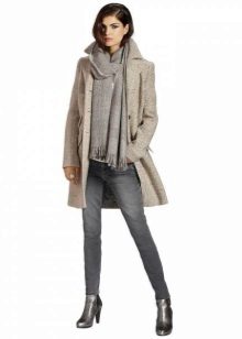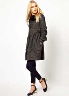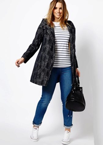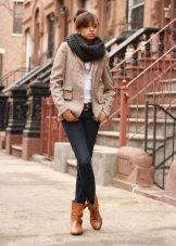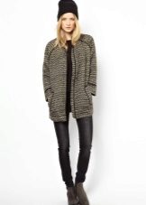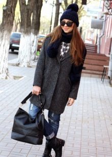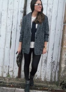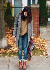 The ensemble can be supplemented with tight tights and a large scarf. Chelsea shoes on his feet.You can not get out of style with long slims and skinny jeans. On the head there is a knitted hat, on the feet sneakers or sneakers.