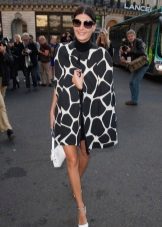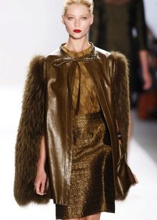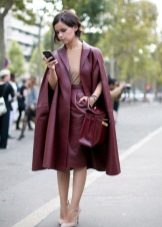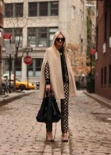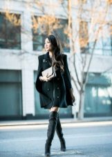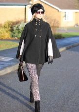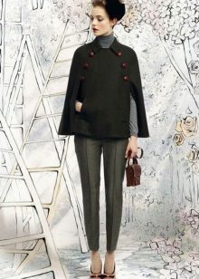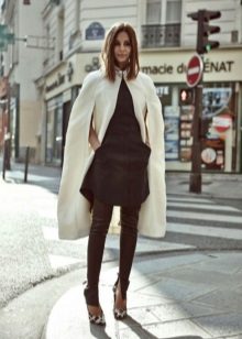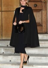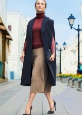 To add even more femininity, you should choose a skirt. The pencil skirt is most suitable, since with caped models cape can look ridiculous. A straight cut dress is also suitable, perhaps even the presence of cuts on it. In combination with a skirt and dress, it should be remembered that outer clothing should be about the same length with them.