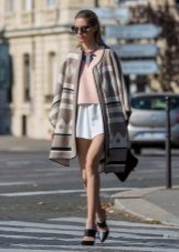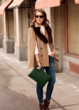Caps are voluminous, therefore, in order not to look like in a hoodie, you should choose only tight-fitting things in the kit. The most win-win option is skinny jeans. However, it is worth being careful with the choice of their style, as rude and bold models will definitely not suit such elegant outerwear. It is worth taking on tight pants, leggings, shorts.
