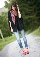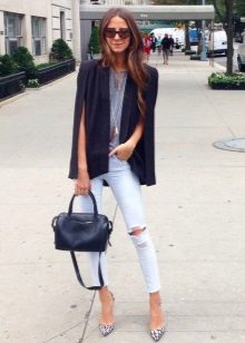 Since capes do not have sleeves, it is assumed that the clothes underneath him - blouses, shirts, have them. Capes in combination with elongated large knit sweaters look interesting. On warm days, you can bare your shoulders by wearing tunics, tops and blouses with short sleeves or without them at all.