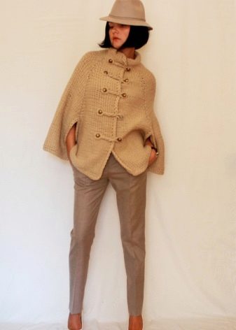 Styles can be divided into two large groups, and they depend on the type of fasteners. Those capes that have buttons or hooks only on their necks are very similar to raincoats. With such a coat it is very important what is worn underneath, because the whole image is visible and nothing is hidden under the outer clothing. Caps with buttons along the entire length look more like coats, especially fitted models. And those and others may have different cutouts for the sleeves: sometimes the whole arm is visible, starting from the shoulder, and sometimes only the wrist and palm.