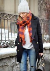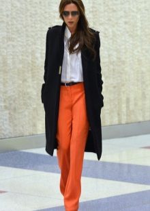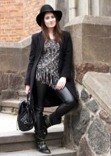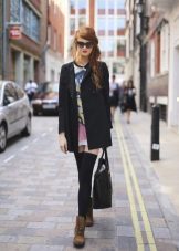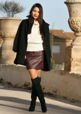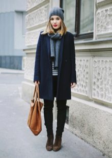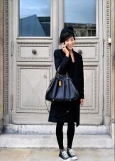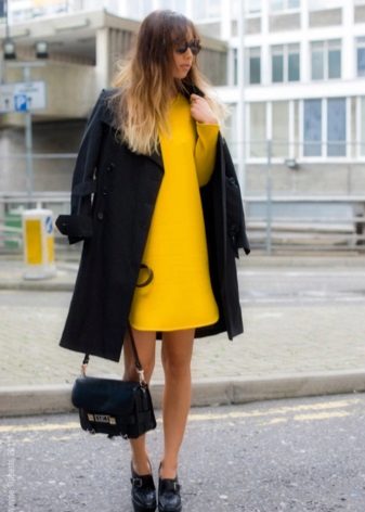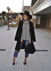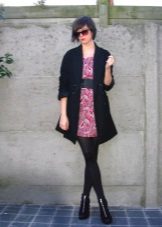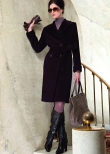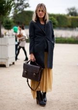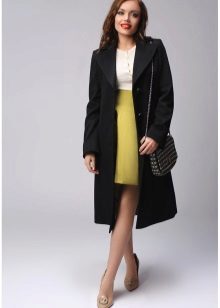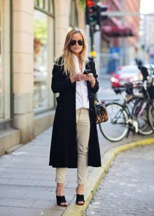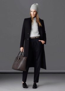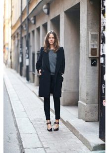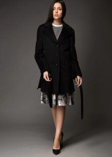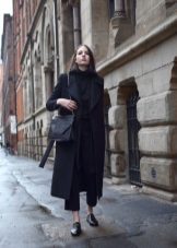 A black coat in tandem with a dress or skirt looks beautiful and feminine, while there can be any color scheme. It is advisable to select other elements of the wardrobe also made in the classical style. Translucent tights can be worn under the skirt. When choosing shoes, it is worth giving preference to pumps or heeled boots. A long coat can be combined with a mini or midi length skirt.