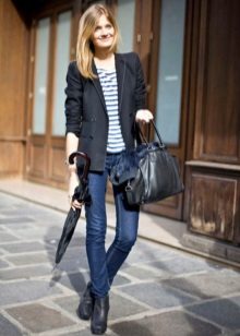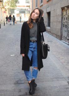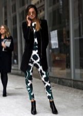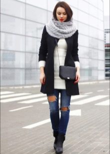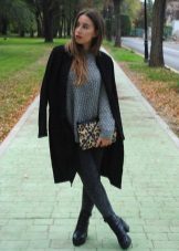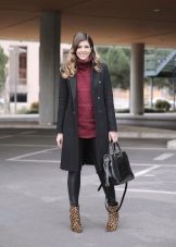 A tandem of a black coat with a dress of gray, emerald, coral or purple shades looks stylish and effective. For every day you can wear a light blouse and blue jeans. To create an elegant look, a leopard print skirt, a white sweater, and high-heeled ankle boots will be a great solution.