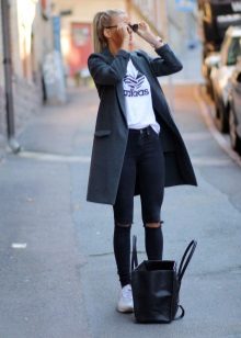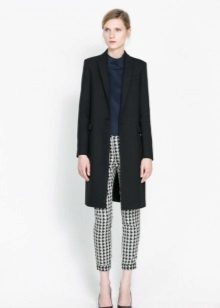 A short black coat reaches the middle of the thigh, which is why it is also called a jacket coat. With such a long coat, you can wear trousers both narrowed and wide. An excellent solution would be a pencil skirt to embody a stylish business look. You should not wear long things with a short coat that will peek out from under it (for example, blouses or tunics).