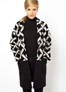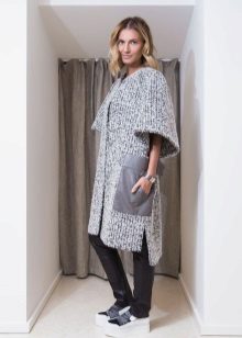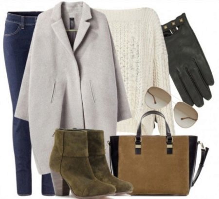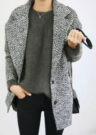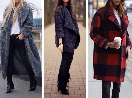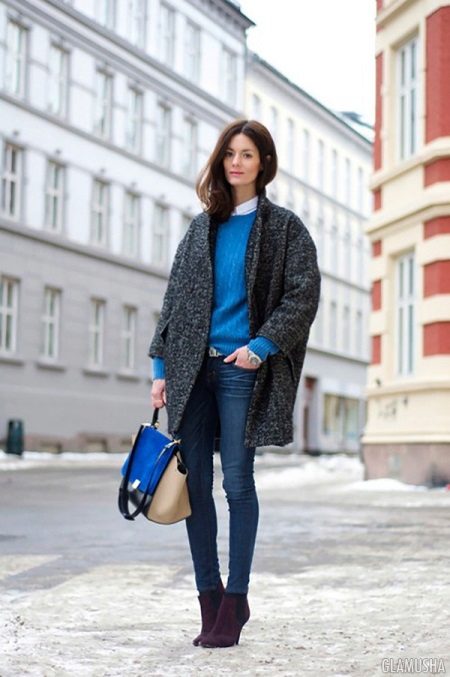 This season, the bows of a cocoon coat with trousers look especially interesting. The ideal option is shortened models with narrowed legs, length - 7/8. The ensemble with skinny jeans also looks stylish. Thick black tights are another stylish combination.