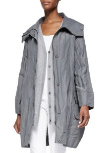 An unusual and fresh look is a cocoon coat with a hood. It combines classical and sporty styles.