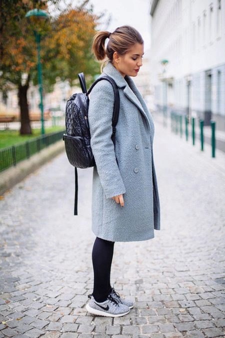 The same case when eclecticism is appropriate. A feminine coat, sports sneakers and a leather backpack in casual style. Tight leggings do not create excessive volumes, all attention is paid to the unique graceful curves of the cocoon coat.