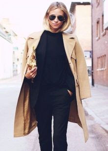 Let us turn our attention to one of the most famous women, whose images inspire women from all over the planet. Of course, this is Kate Middleton. The eye rejoices at such a restrained, moderately elegant image, in which there is not a single superfluous detail, but I do not want to add anything to it. A dark coat with thin leather stripes on the sleeves that echo the waistband goes well with black elements in the form of black shoes, clutch bag and golf. That is what a true lady should look like.