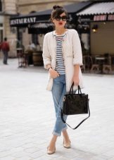- Boyfriends, a cropped white blouse, white coat, blue slip-ons and a black handbag with a long strap.Great solution for every day.