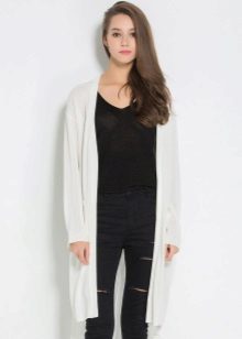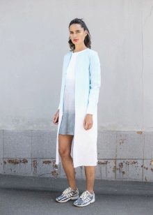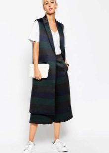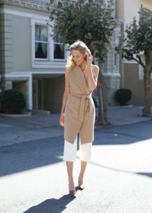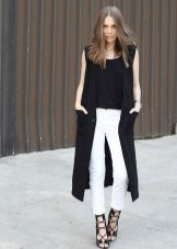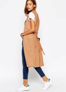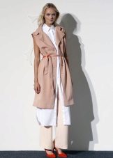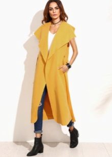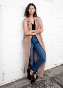 The sleeveless coat resembles a long vest and can be sewn from any lightweight fabric. The optimal length is to the middle of the knee. Today it is a fashionable piece of clothing that goes well with jeans, dresses or trousers.