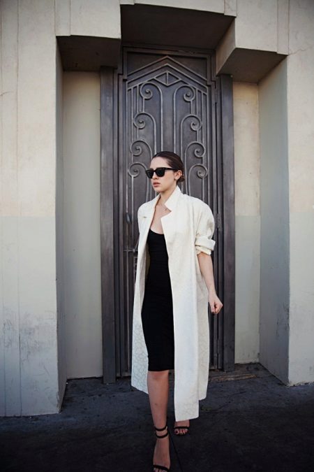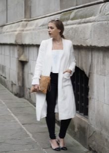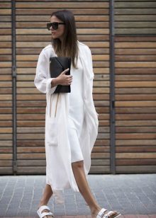 Let's look at images with a white coat of a similar cut. This will allow you to visually see how a summer basic coat can be added to any fashionable look.