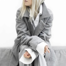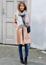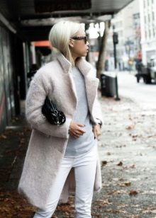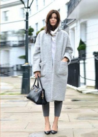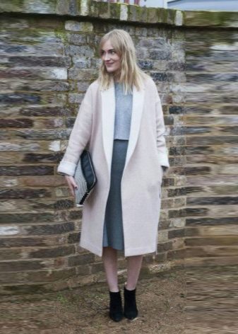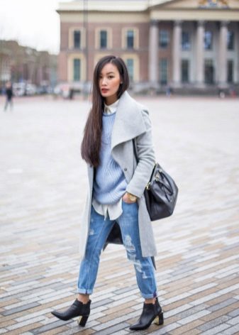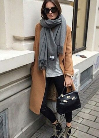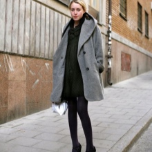It’s easy to choose shoes and accessories for a light coat. Consider, for example, a pale gray version. With it, the ensemble can be composed using bright, but at the same time quite calm colors. So, with a light gray coat you can wear a dress or skirt in a coral shade, tight black tights and beige ankle boots with high heels. The bag may be black or dark gray.