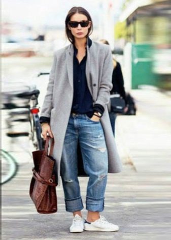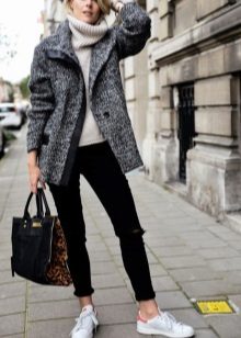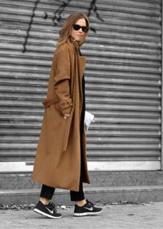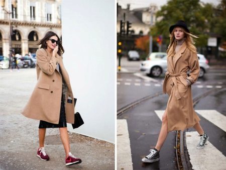 Oddly enough, but sneakers, like sneakers, are best combined with classic coat models. Outerwear in this case should be concise and minimalistic, especially if the shoes are distinguished by an abundance of colors.