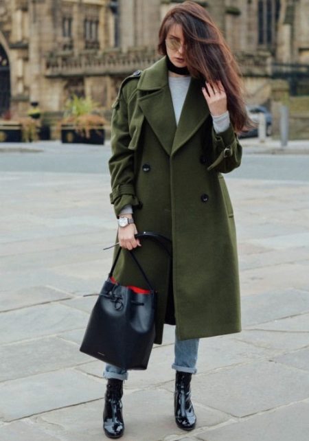 The coat, as if removed from the shoulder of a boyfriend, is made in the style of a military. The color of autumn grass is in perfect harmony with the classic shade of jeans used in the ensemble. Black shoes and a bag, light gray longsleeve - the image is simple, concise, suitable for every day.