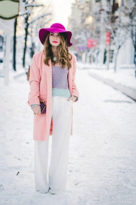 The delicate gamut is set off only with a hat with soft fields of a bright shade of fuchsia. Straight classic pants, a straight cut coat of medium length - an ideal combination of textures and shapes.