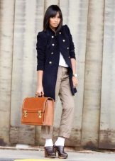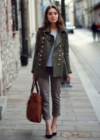 A variety of shoes fit under the military coat, which will only emphasize your chosen image. It is best to match the tone of the coat. In this style, it is worth giving up contrasting combinations.