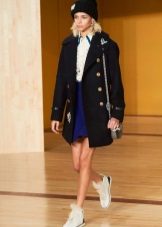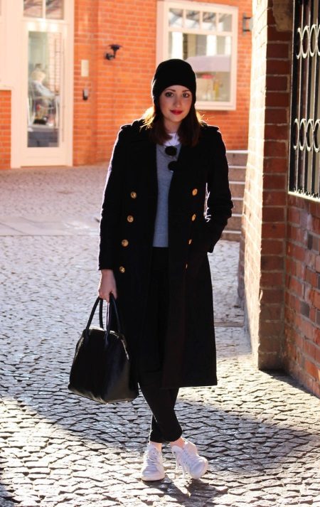 In this image, the military style is mixed with sports. A coat with a turn-down collar and copper buttons resembles an overcoat, under which a black bag and a knitted hat are matched. Under tight black jeans, a blue jacket is put on, the color of which softens the dark shades of the ensemble of clothes. Contrast white sneakers. This is an image for every day.