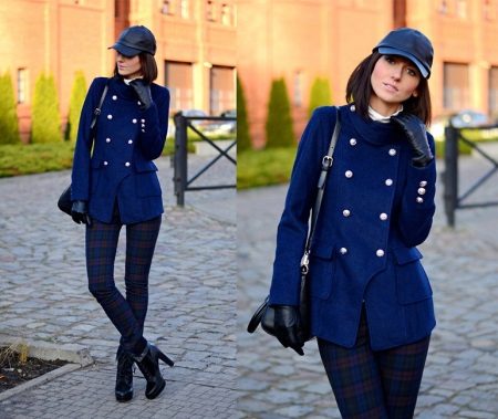 A short coat looks best with tight trousers. In our case, under the outerwear, checkered pants are selected, which add a certain femininity to the whole image. Black ankle boots with lacing and high heels, a leather cap bring us back to the military style. Accessories in the form of black gloves and a bag add rigor and consistency.