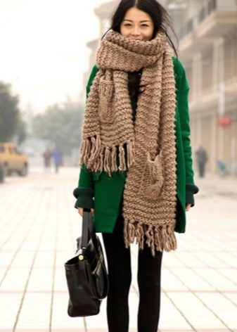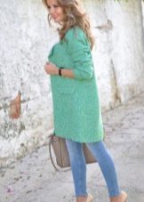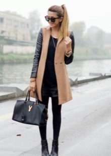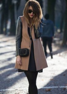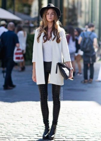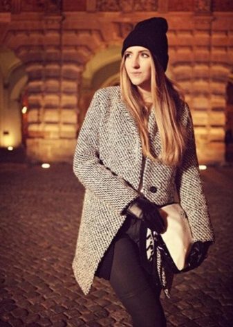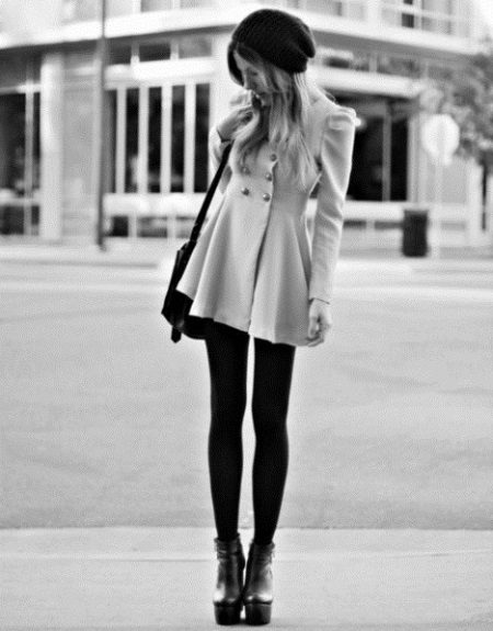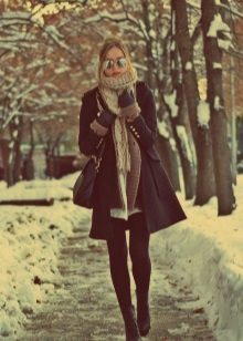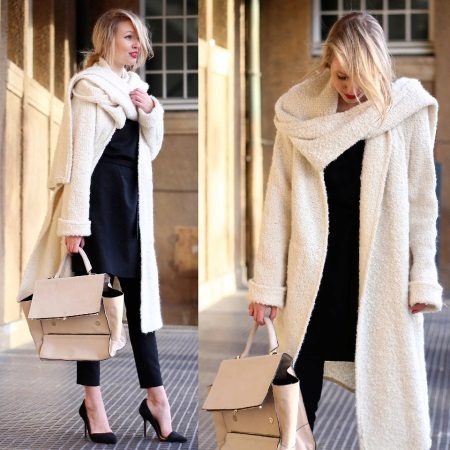 A knitted model of a thin ivory coat looks very tender and feminine. Complete with black tunic and leggings, the look will be stylish and suitable for everyday use.