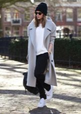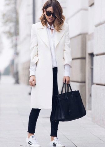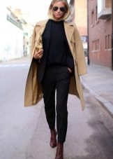 An elegant combination is obtained with white straight-cut trousers and a beige knee-length coat. Brown ankle boots and a small bag will perfectly complement your outfit.