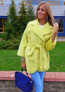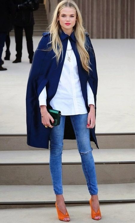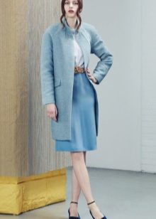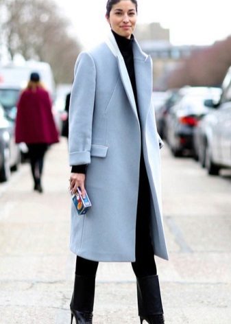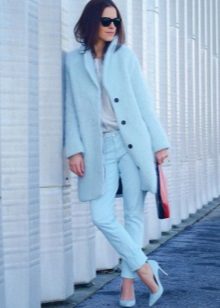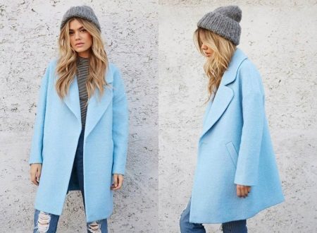 A sky-blue coat of a free cut on one button will become a luxurious attribute of the wardrobe, pleasing in the autumn rainy weather and eliminating the seasonal blues. Combined with a light pinstripe blouse and ripped jeans, the outfit will be hooligan stylish.