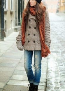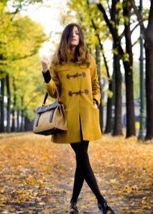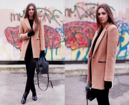A peach-colored rag coat is a great fall option. In combination with black jeans, a blouse and ankle boots, the look will be harmonious, no frills. And the details in the form of a bag and gloves in black will be a worthy addition.
