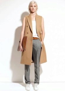 Sleeveless coats are in fashion. It is not suitable for a cold autumn, but for its beginning such a thing is quite optimal. In order not to freeze the handles, warm turtlenecks, sweaters or long gloves are used under such a coat.