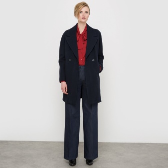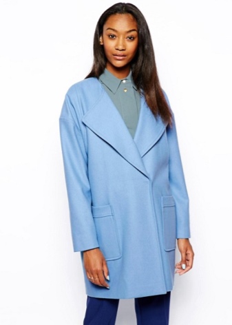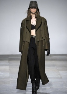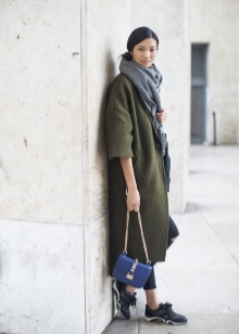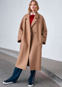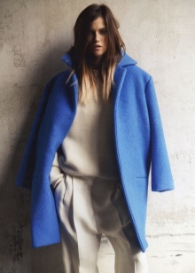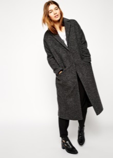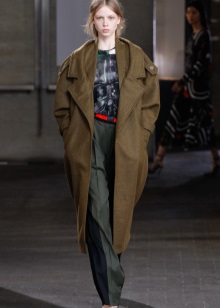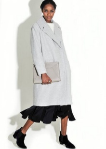 - Oversized voluminous coat. Its distinctive features are a slightly flat, rounded shoulder line and dimensionlessness. This is true, the size does not matter at all, the coat can be even several sizes larger.