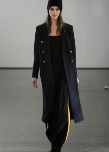 - Coat frock coat. A straight silhouette model with lapels, it resembles an elongated jacket.The coat is distinguished by neat shapes and clear lines, it is borrowed from the business wardrobe of the strong half. Such a thing should sit correctly on the shoulders, but not fit the figure, but be free enough.