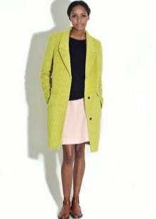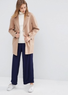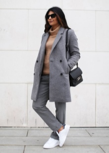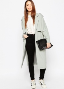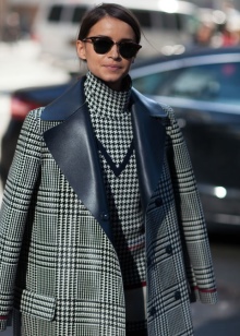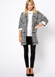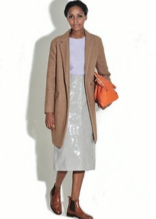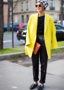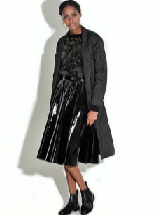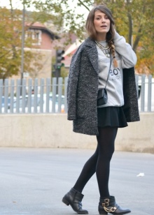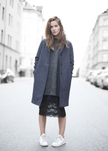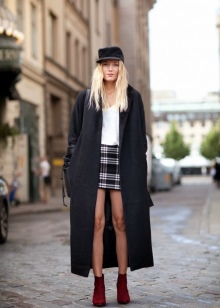 With a coat in a men's style, a mini or midi pencil skirt will look best. A win-win option is a leather skirt paired with tight black tights.