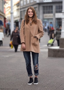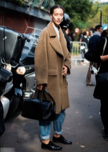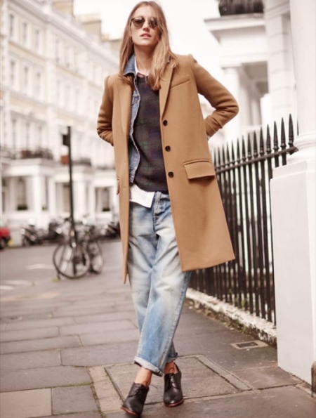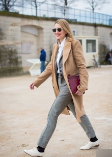 - Androgynous look with camel coat overcoat. In this case, the girl relied on layering and deliberate negligence - a white shirt, tucked in only half, a checkered jumper, a denim jacket and free boyfriends. The image is complemented by derby shoes and sunglasses.