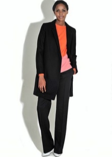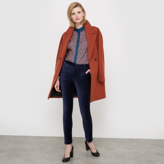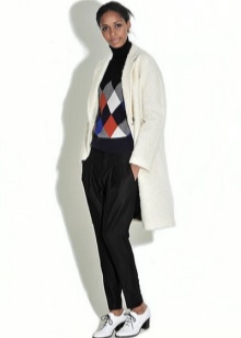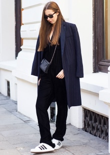 Give preference to narrowed to the bottom or shortened trousers, classic models will also look good. If you still want to choose a free cut model, give preference to a light flowing fabric so that the image does not turn out to be bulky.