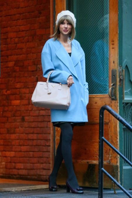 - To look gentle and feminine, take the example of Taylor Swift. Wear a puffy dress to the knee with a light blue coat. Complement your look with tight dark tights, stiletto pumps and a light beret.