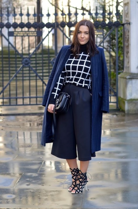 - Wear a long frock coat with navy culottes and a black turtleneck in a large white cage for work. Complement your look with high-heeled shoes and a small handbag. A great look for those who are accustomed to look business-like in the office.