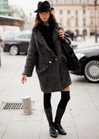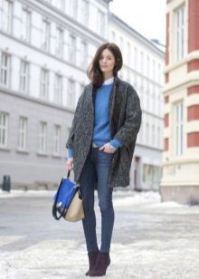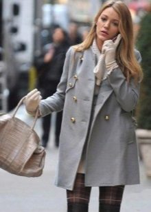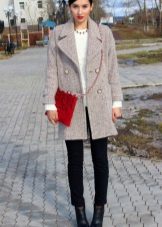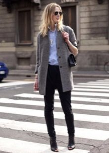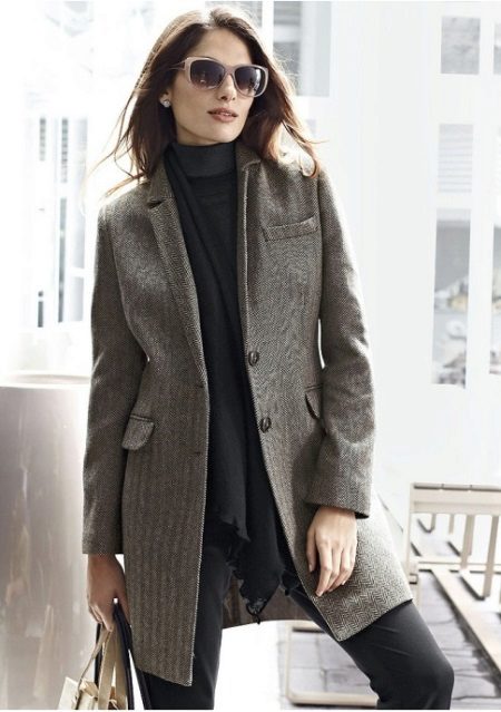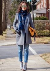 A universal coat-jacket with a gray color of a classic straight cut and a length just below the waist looks great in combination with a multi-tiered skirt or dress above the knee length. From shoes, shoes or high-heeled shoes should be preferred. And if you add a bright volumetric scarf to the neck, then such a model can be worn without buttoning.