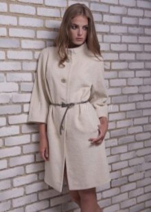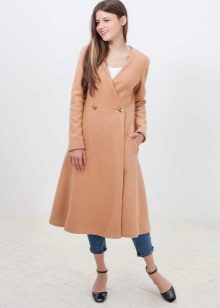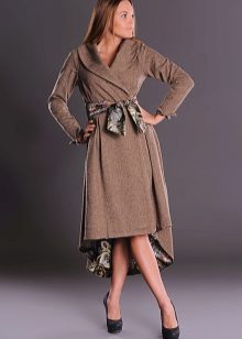 A coat cut as a kimono without a collar is also one of the models of the coat-dress. This product is sewn not only without a collar, it also has no fastener and is worn by smell.