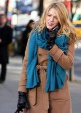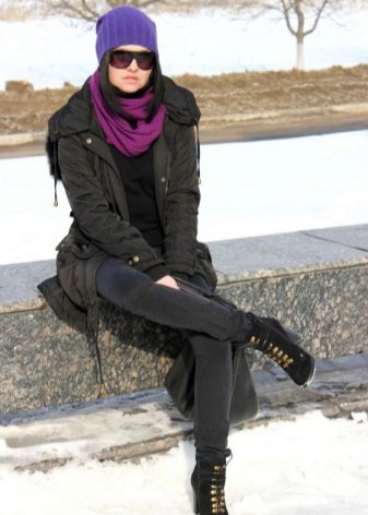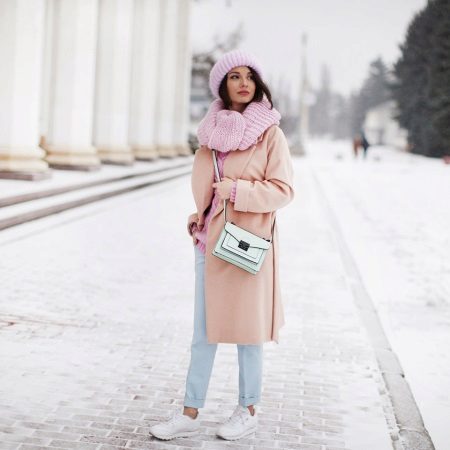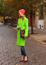 If the coat is dark shades, then you can revive his image with bright hats and scarves. Under black, navy blue and gray, accessories in red, bright green and coral are well suited.
